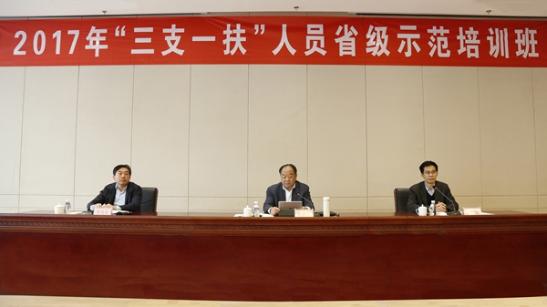 开班仪式上,邹广德代表学校对省人社厅领导和“三支一扶”人员表示热烈的欢迎。他简要介绍了学校发展历史和办学特色,并表示将全力做好各项保障工作,确保培训班顺利举办。夏鲁青代表省人社厅、省“三支一扶”大学生工作领导小组办公室作了讲话。