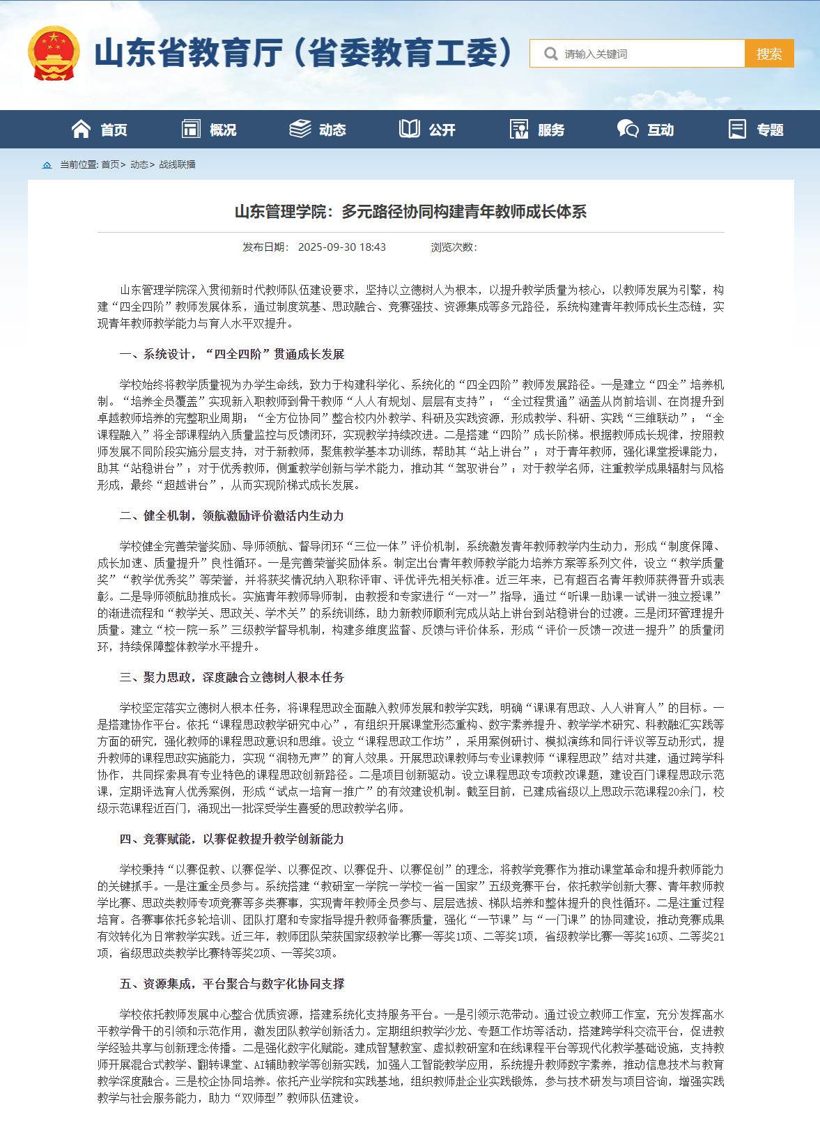 9月30日,山东省教育厅(省委教育工委)以《山东管理学院:多元路径协同构建青年教师成长体系》为题,报道我校深入贯彻新时代教师队伍建设要求,坚持以立德树人为根本,以提升教学质量为核心,以教师发展为引擎,构建“四全四阶”教师发展体系,通过制度筑基、思政融合、竞赛强技、资源集成等多元路径,系统构建青年教师成长生态链,实现青年教师教学能力与育人水平双提升的经验做法。
