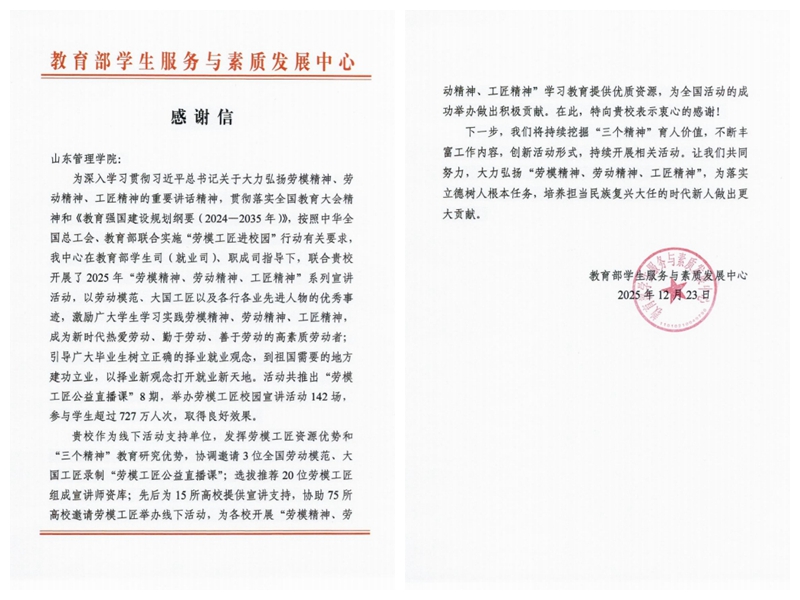 为深入学习贯彻习近平总书记关于大力弘扬劳模精神、劳动精神、工匠精神的重要讲话精神,贯彻落实全国教育大会精神和《教育强国建设规划纲要(2024-2035年)》,按照中华全国总工会、教育部联合实施的“劳模工匠进校园”行动有关要求,教育部学生服务与素质发展中心在教育部学生司(就业司)、职成司指导下,协同我校等若干单位开展了2025年“劳模精神、劳动精神、工匠精神”系列宣讲活动。鉴于我校在活动举办中做出的积极贡献,教育部学生服务与素质发展中心给予充分肯定和高度赞许,并发来感谢信。