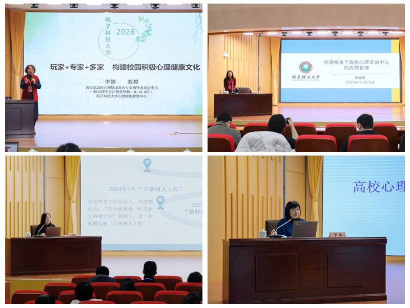 在专家讲座环节,教育部高校心理健康教育专家指导委员会委员、电子科技大学心理教育中心首席李媛教授以“构建校园积极心理文化”为题,分享了积极心理文化建设的创新思路与实践案例;中国心理学会临床心理学注册工作委员会主任委员、北京理工大学教育学院贾晓明教授从伦理视角出发,深入剖析高校心理咨询中心内部管理的关键问题与规范路径;中国大学生在线、全国高校思政网副主任郑骊君围绕“心理中心品牌建设”展开阐述,为高校心理中心品牌打造提供了理论支撑;教育部普通高校心理健康教育专家指导委员会副秘书长、清华大学学生心理发展指导中心首席专家李焰教授则聚焦“高校心理中心的顶层设计与路径规划”,为高校心理健康教育中心工作的长远发展提供了战略指引。
