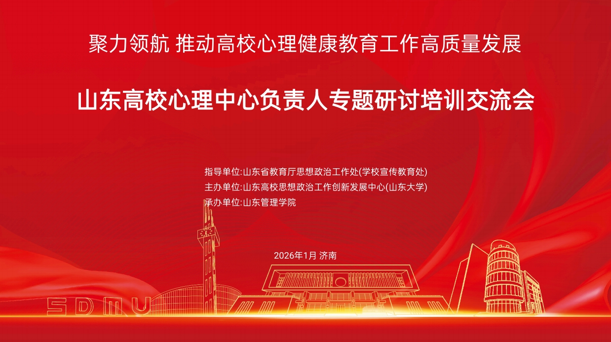 1月15日-16日,“山东高校心理中心负责人专题研讨交流会”在山东管理学院举办。山东省教育厅思想政治工作处处长陈成标、山东管理学院副校长王艺、山东高校思想政治工作创新发展中心(山东大学)负责人马毓轩出席开班仪式。
