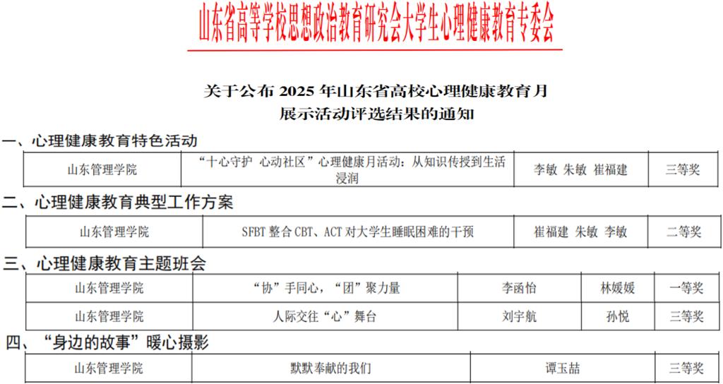 在山东省教育厅等4部门关于2025年山东省学生心理健康宣传教育月评选活动中,我校提交的《“十心守护 心动社区”心理健康月活动——从“知识传授”到“生活浸润”》获评全省学生心理健康宣传教育月特色活动;《SFBT整合CBT、ACT对大学生睡眠困难的干预》获评全省学生心理健康教育指导典型案例。