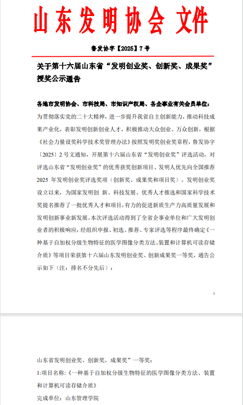 近日,山东省发明协会发布了第十六届山东省“发明创业奖、创新奖、成果奖”评审结果,经评审,我校获一等奖1项。