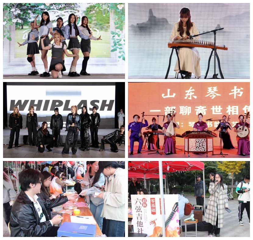 社团文化展演共有36个表演节目,现场互动氛围热烈,展现了学生社团的青春风采。琴声书韵曲艺社带来的山东琴书《一部聊斋世相传》,让现场观众沉浸式感受山东地方文化的深厚底蕴;六弦吉他社团先后带来《我好像在哪见过你》的温柔叙事与《想你的夜》的深情告白,吉他弦音与歌声交织,将青春心事娓娓道来;百忧解社团用极具张力的演唱传递“打破束缚、敢做自己”的青春态度,瞬间点燃全场氛围;ST街舞社舞者们以精准的节奏、利落的动作,将街舞文化的酷感与激情挥洒得淋漓尽致;志愿服务类社团与学创类社团打造的综合风采展示节目,展现了学生们扎根实践、心系社会的青春担当。