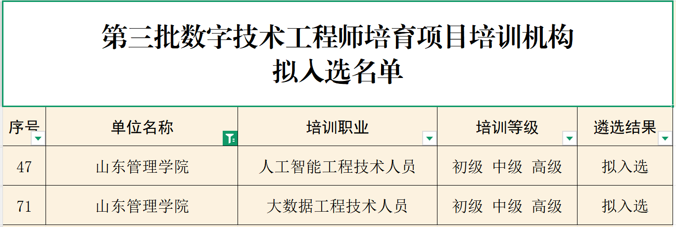 近日,山东省人力资源和社会保障厅公示了第三批数字技术工程师培育项目培训机构拟入选名单,经严格遴选,山东管理学院申报的“人工智能工程技术人员”“大数据工程技术人员”两个项目成功入选,培训等级涵盖初、中、高级,有效期3年。