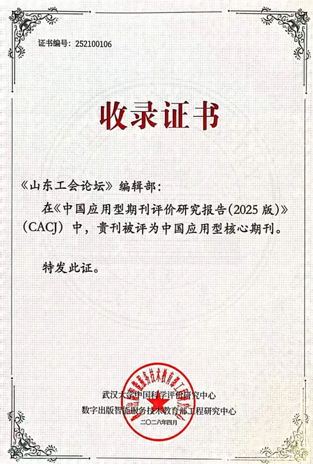 近年来,《山东工会论坛》深入践行开门办刊、专业办刊、数字化办刊的理念,办刊质量大幅提升,先后入选“全国高校优秀社科期刊”“人大复印报刊资料高转载期刊”“AMI扩展期刊”“RCCSE中国准核心学术期刊”。2019年以来,本刊在人大复印报刊资料转载指数排名中屡获佳绩,共被人大复印报刊资料全文转载57篇,全文转载率均突破10%,其中2025年转载率达18.37%,期刊复合影响因子提高到1.082,CI排序升至Q3区,学术影响力和美誉度持续提升。此次入选,标志着我校学报的学术质量、行业影响力与应用价值获得权威评价机构的持续认可。