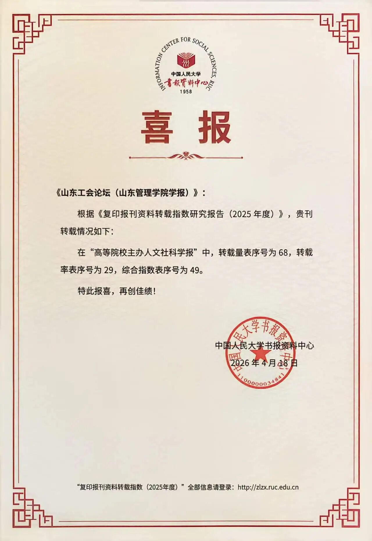 4月18日,中国人民大学书报资料中心研制的《复印报刊资料转载指数研究报告(2025年度)》正式发布,我校学报《山东工会论坛》再创佳绩,转载指数排名稳步提升。